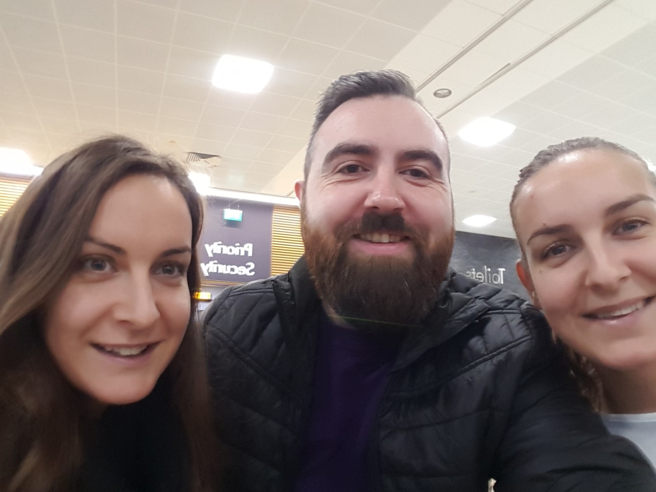 My wife took me to the airport and after some tears (mostly mine). I kissed her and the little one goodbye, and rolled off to my destination. Being a little anxious, I arrived in plenty of time and had the staff at EasyJet tag my chair. I was only away for the night so there was no need to check my bag. Unknown to me, Cheryl had already made her way to security and was on her way to Starbucks. When she notified me, I made my way up in the lift and to security. Along the way I managed to bump into my manager from work and her sister, who were proudly wearing purple, (a violet Nike swoosh still counts Sarah!).