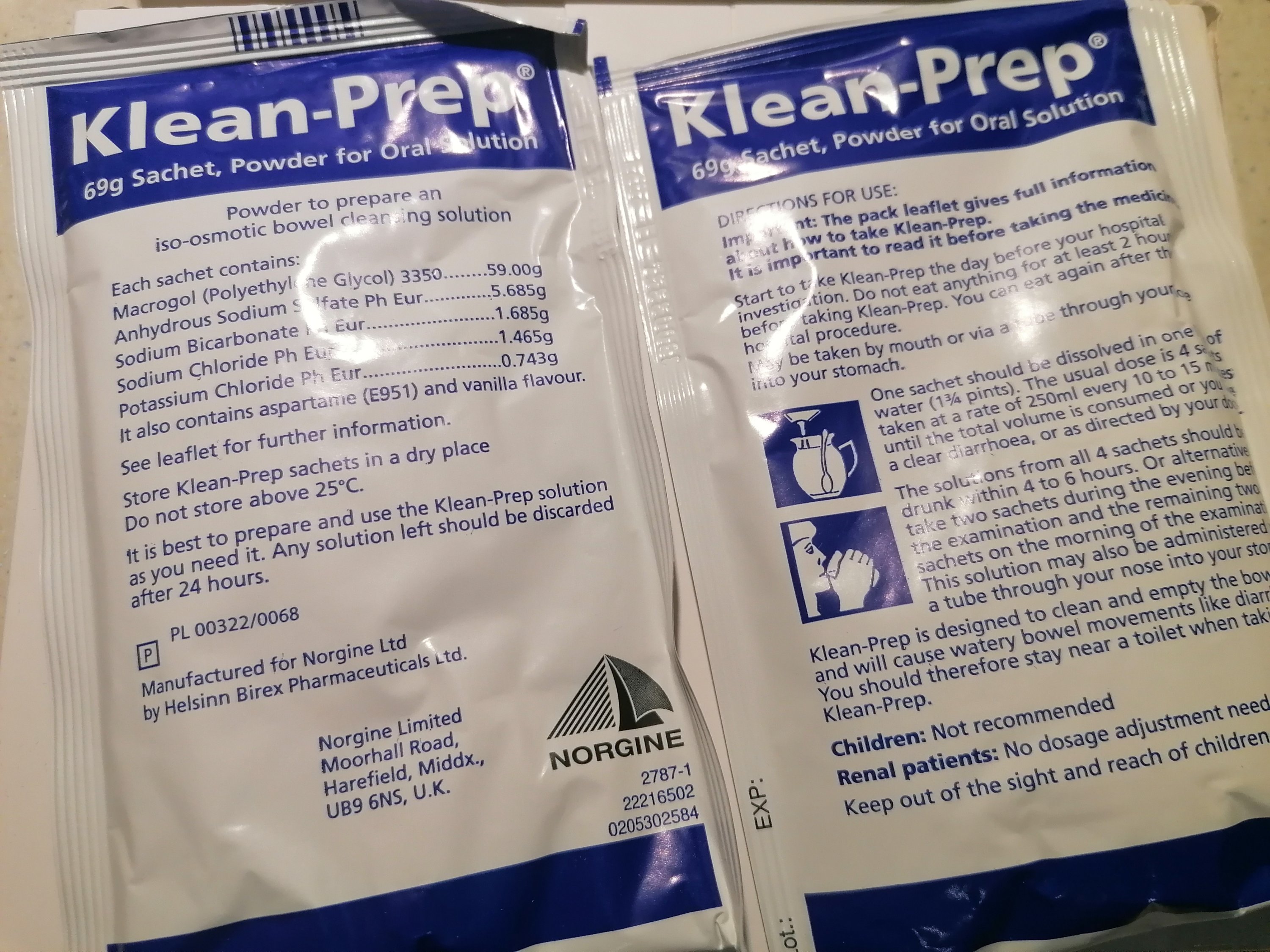 Then it was time for the clear out. I had 4 litres of Klean Prep to drink and many many trips to the toilet. I had to fast from 1pm the day before the procedure, with the appointment being at 1.30pm. I considered eating all the food but then I thought that I’d still need to “process” it.