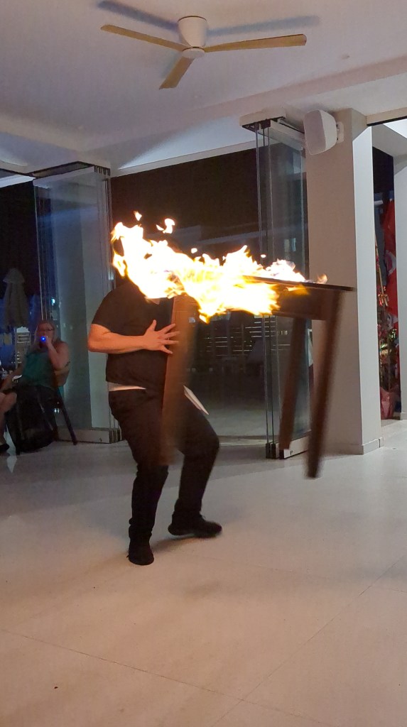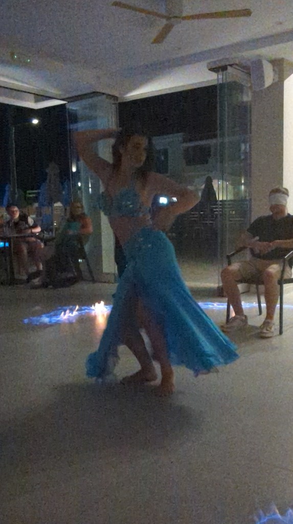 They host a Greek night on Mondays, with food provided, fire dancing, belly dancing and plate-smashing. Spyros made a point of including Ben, cheering his name as he threw his plate into the circle of broken plaster. The plates aren’t ceramic for health and safety reasons, but that fire is very real!