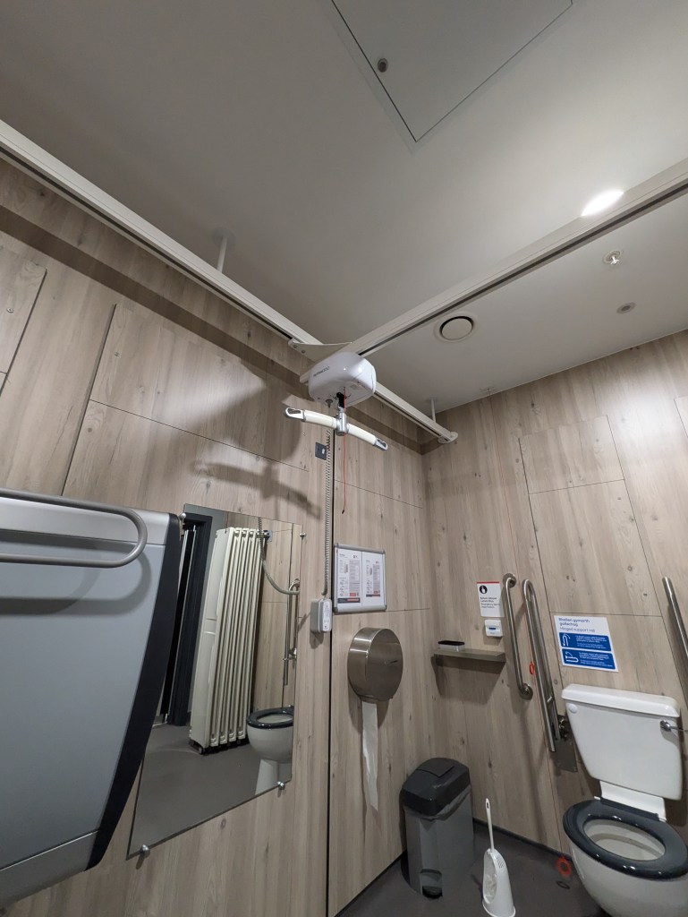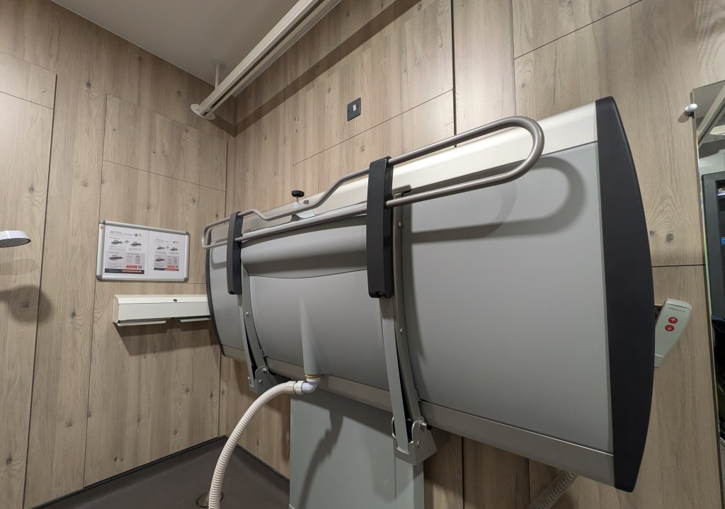 I used one accessible toilet, which had a right-side transfer space, and whilst it is small, it can accommodate a power chair and an additional person.