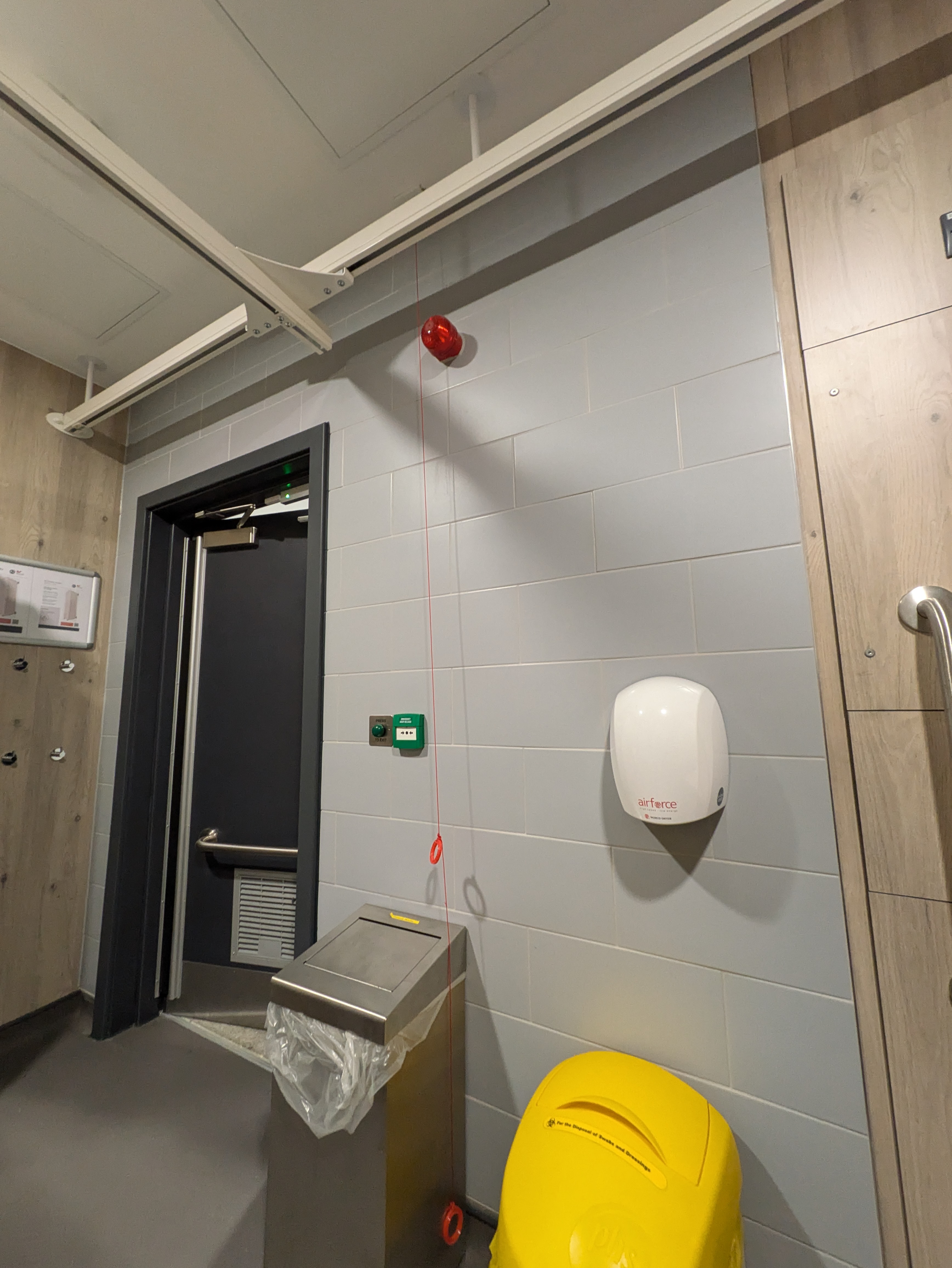 Red emergency cords are installed both at the toilet seat and at the door, and the cords were hanging to the floor during my visit.