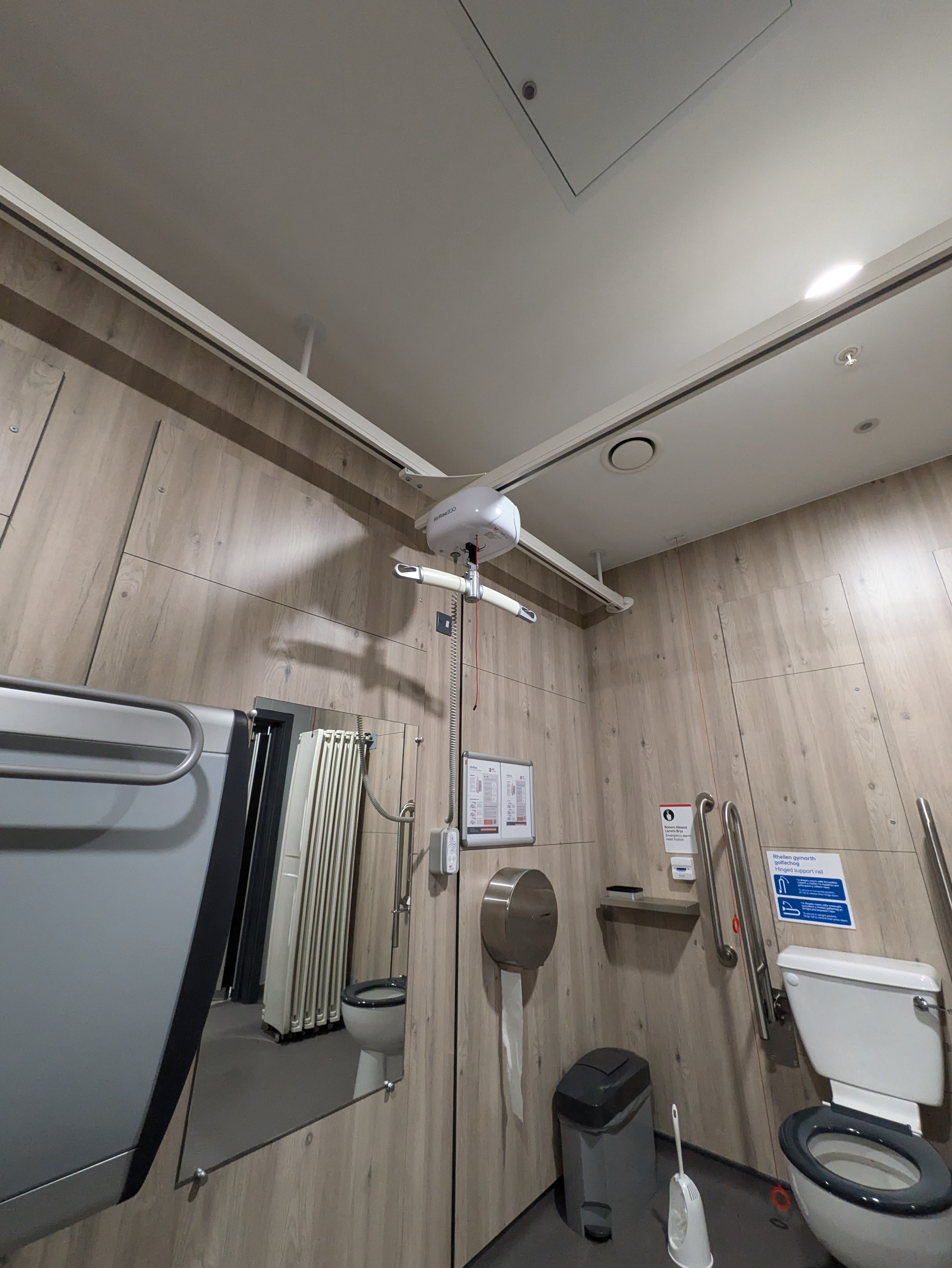 This toilet features a ceiling track hoist and a height-adjustable changing bed, with a large paper towel dispenser.